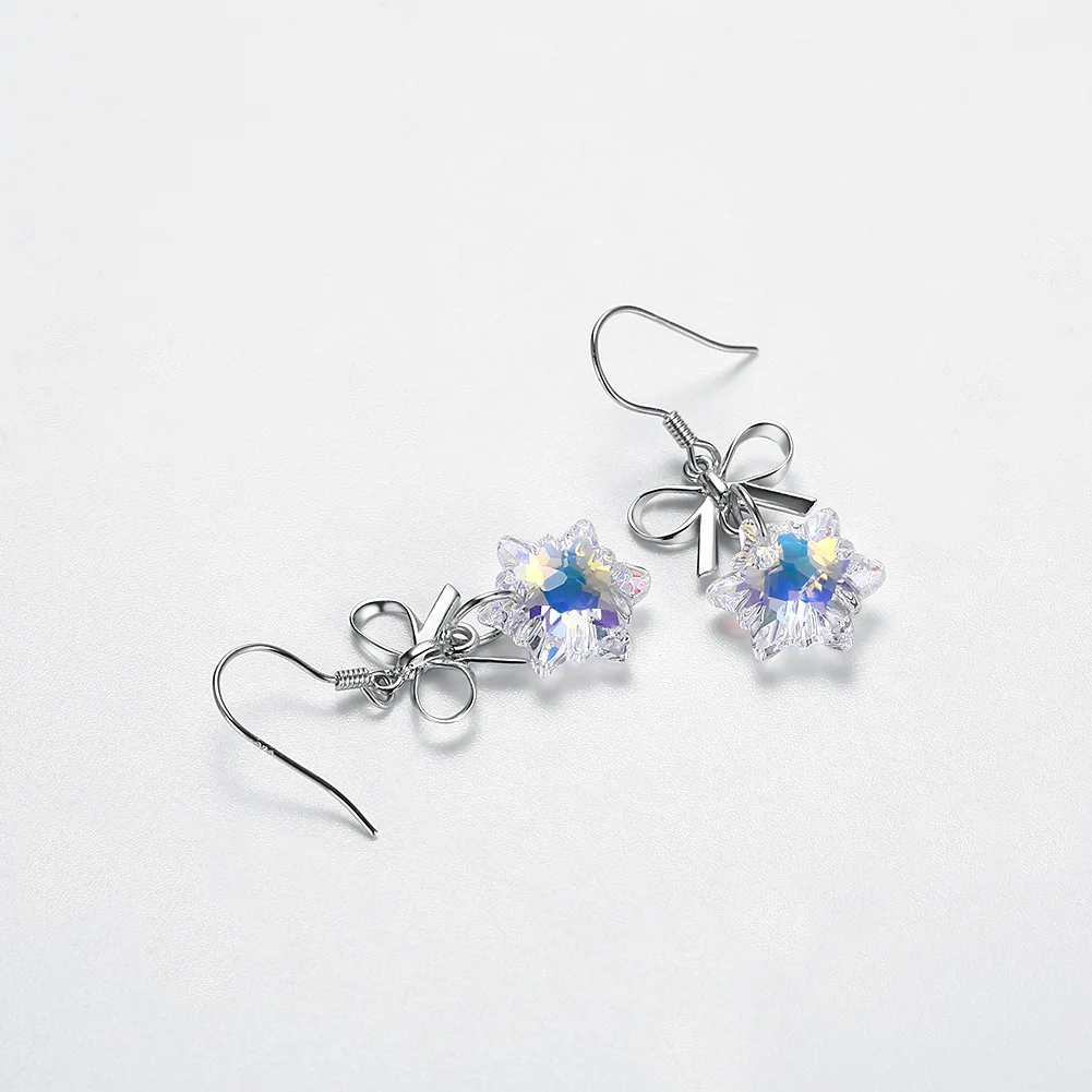 BEST Clear crystal flower tag with bow pendant drop hook earrings for women christmas snowflake pure 925
