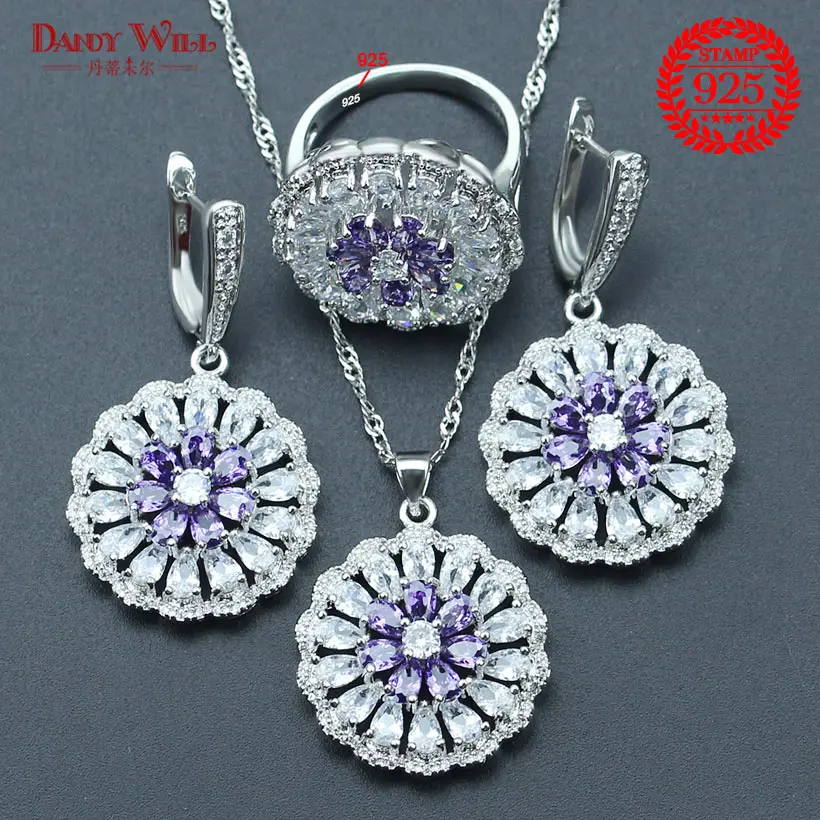 BEST QUALITY 925 Sterling Silver Bridal Jewelry Purple Cubic Zirconia White Zircon Jewelry Sets For Women Earrin