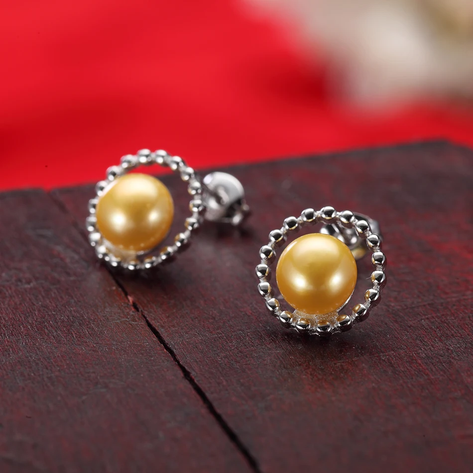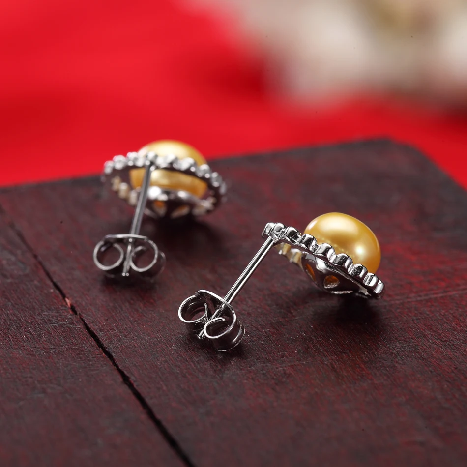 FEIGE Fashion style Real 925 Silver Stud Earring 7-8mm Golden Freshwater Pearl Earrings for Women F